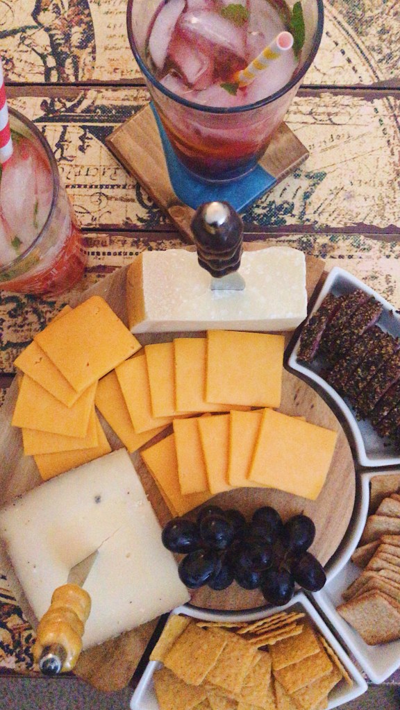 Friday night we made a giant cheese board which included sharp cheddar, a flavorful parmesan, a Black Pepper BellaVitano, (highly recommended) and a peppered salami with some classic Wheat Thins and Good Thins. It was the perfect little happy hour (or four!) snack with our not fully pictured homemade gin and tonics (blackberry & mint, strawberry & basil).